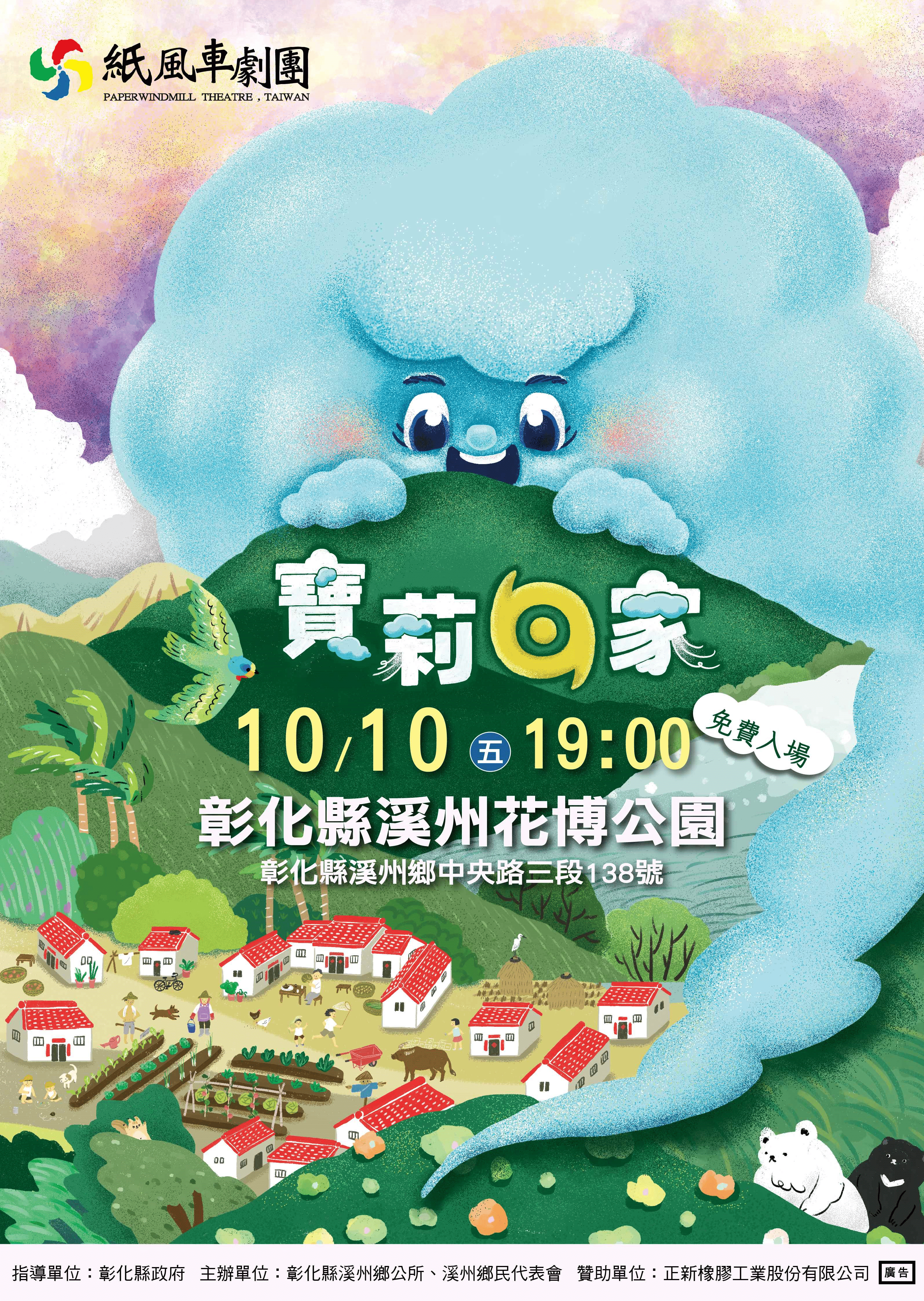 10月10日(星期五)晚上7點於溪州鄉溪州公園,演出「紙風車兒童劇團」《寶莉回家》,免票入場,歡迎闔家觀賞。
