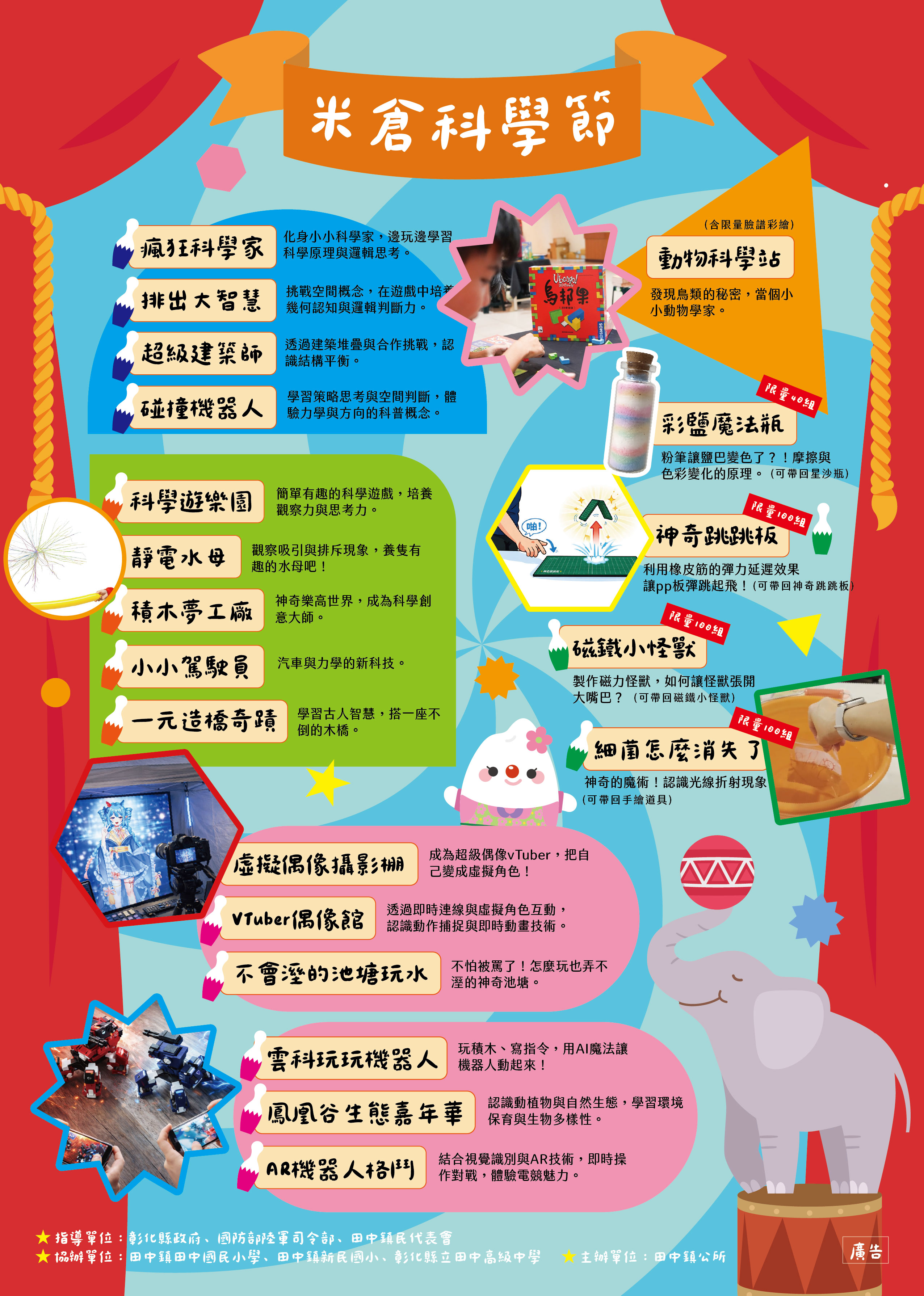 本鎮環境保護宣導暨慶祝兒童節活動,擬於115年4月11日 (星期六)上午9時假彰化縣立景崧文化教育園區擴大舉行, 活動內容包括大型小丑踩街、小芙妮表演、滑步車運動、 積木比賽及科普攤位探索等。